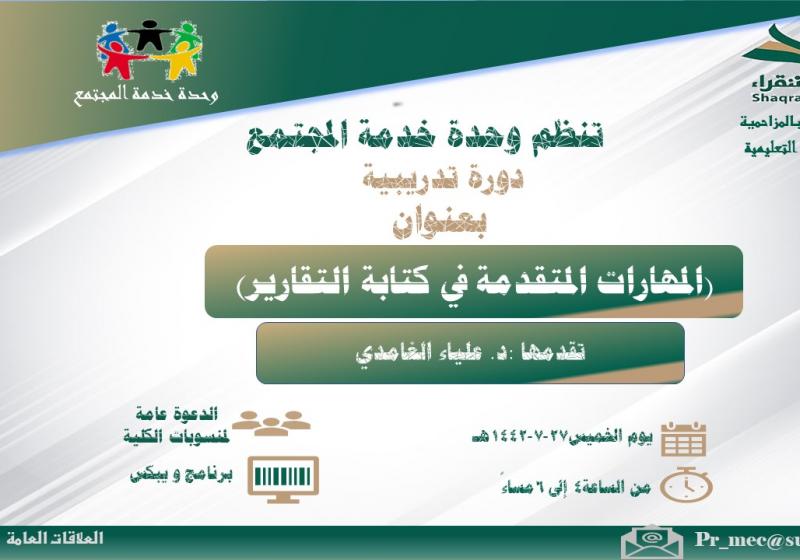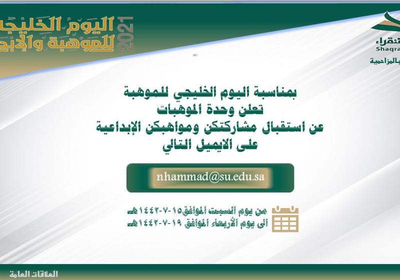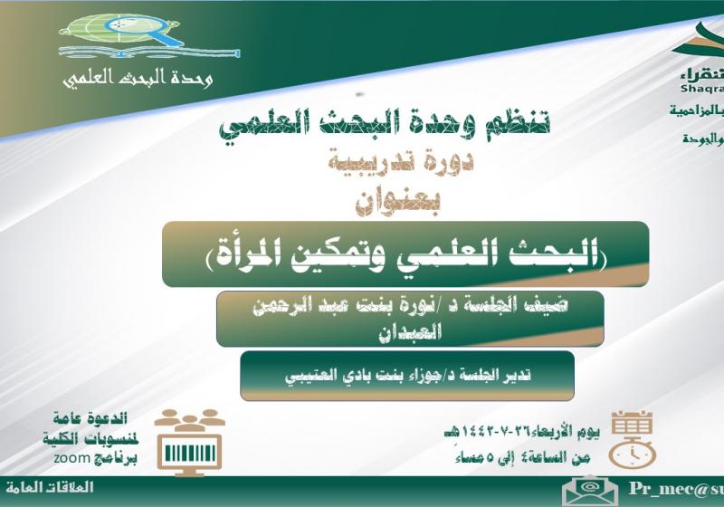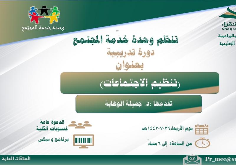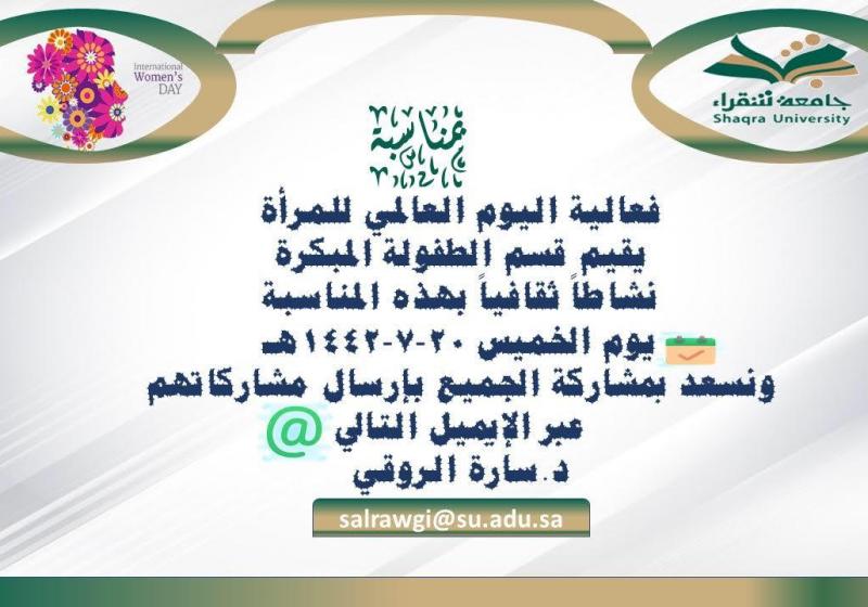 الخميس 4 مارس اليوم العالمي لدفاع المدني الخميس 4 مارس دورة تدريبية " البحث العلمي وتمكين المرأة " الخميس 4 مارس دورة تدريبية في تنظيم الاجتماعات الخميس 4 مارس دورة تدريبية "المهارات المتقدمة في كتابة التقارير " الاثنين 1 مارس للمشاركه باليوم الخليجي للمواهب الاثنين 1 مارس ايوم العالمي للمرأه الأحد 4 ديسمبر طباعة الكل في نافذة جديدة ندوة (صوت الخريج) بكلية التربية بالمزاحمية الاثنين 2 نوفمبر جائزة خادم الحرمين الشريفين لحفظ القرآن الكريم في دورتها الثامنة عشر