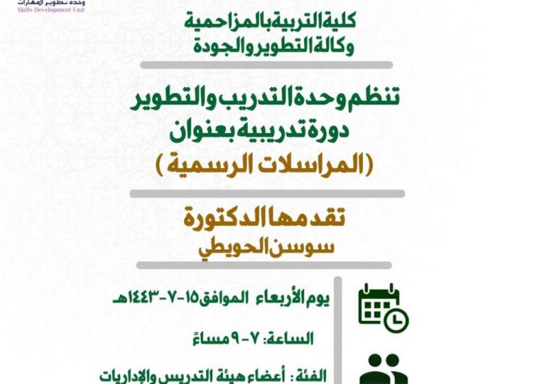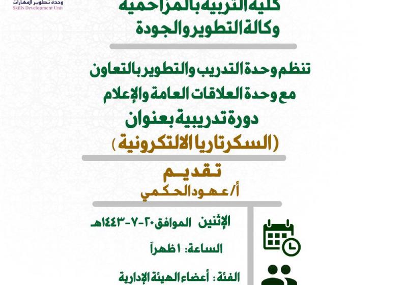 الاثنين 21 فبراير وحدة التطوير والتدريب بالتعاون مع وحده العلاقات العامه تدعوكم لحضور دوره بعنوان السكرتاريا الإلكترونية