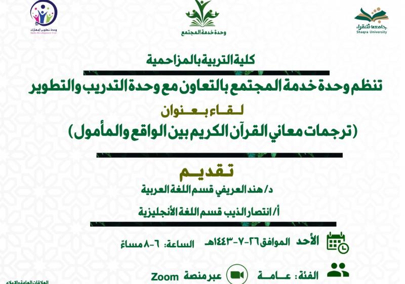 الأحد 27 فبراير تدعوكم وحدة خدمه المجتمع لحضور الدوره التدريبيه ترجمات معاني القرآن الكريم بين الواقع والمأمول