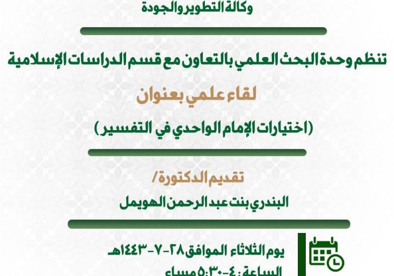 الثلاثاء 1 مارس وحدة البحث العلمي و قسم الدرسات الاسلاميه يدعوكما لحضور لقاء العلمي بعنوان اختيارات الإمام الواحدي في التفسير