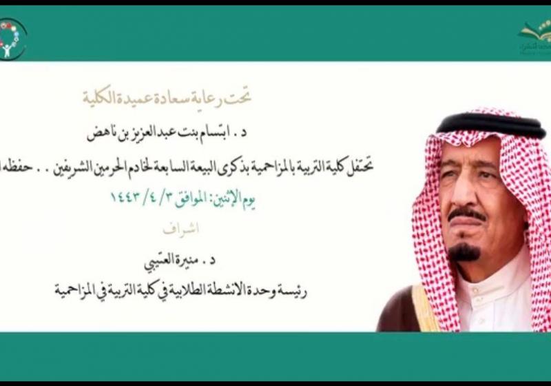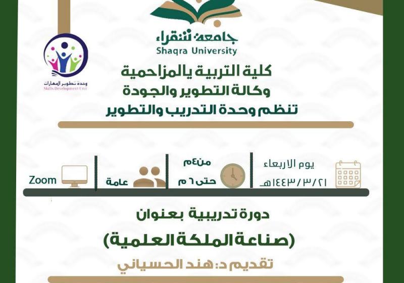 الاثنين 8 نوفمبر ذكرى البيعة السابعة الاثنين 1 نوفمبر تعلن وحدة الانشطة الطلابية بتعاون مع قسم الطفولة المبكرةبكلية التربية بالمزاحمية عن استقبال المشاركاتلفعالية (يوم الطفل العالمي) الاثنين 1 نوفمبر تنظم خدمة المجتمع بكلية التربية بالمزاحمية لقاء بعنوان الترجمة ومفهومها ونشأتها والصعوبات فيها الأحد 31 أكتوبر نادي الطفل بتعاون مع وحدة التطوير والتدريب ينظم دوره بعنوان مهارات الحوار في الطفولة المبكره الأحد 31 أكتوبر وحدة التطوير والتدريب تنظم دورة تدريبية بعنوان التفكير الناقد الأحد 24 أكتوبر تنظم وحدة التدريب والتطوير دوره تدريبيه بعنوان (صناعة الملكة العلمية) الأحد 24 أكتوبر تنظم وحدة البحث العلمي بتعاون مع قسم اللغة الانجليزية لقاء علمي بعنوان ((تعليم اللغة الانجليزية في السنة الاولى من المرحلة الابتدائية) الأربعاء 20 أكتوبر وحدة التدريب والتطوير تنظم دوره بعنوان التربية الفاعلة مشاهدة المزيد