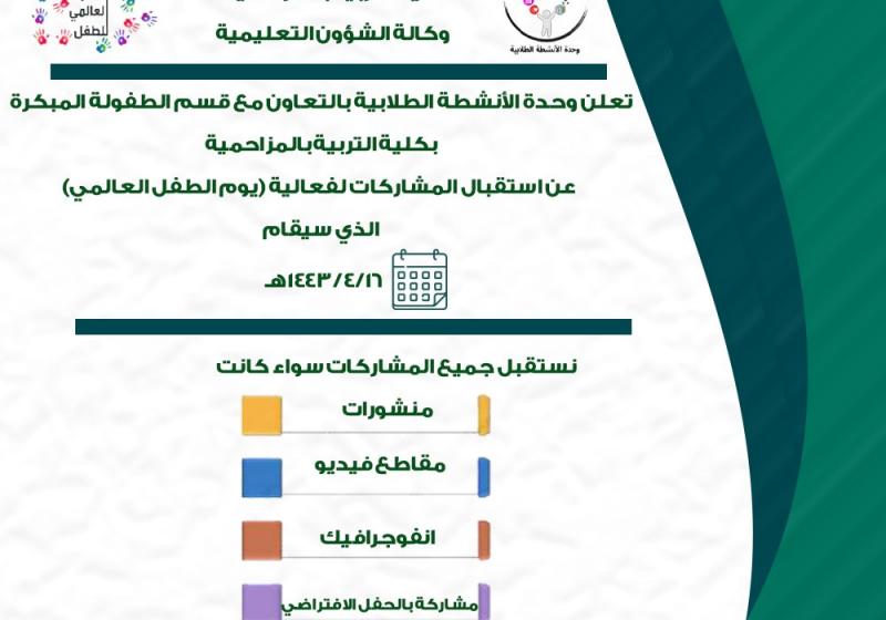 الاثنين 1 نوفمبر تعلن وحدة الانشطة الطلابية بتعاون مع قسم الطفولة المبكرةبكلية التربية بالمزاحمية عن استقبال المشاركاتلفعالية (يوم الطفل العالمي)
