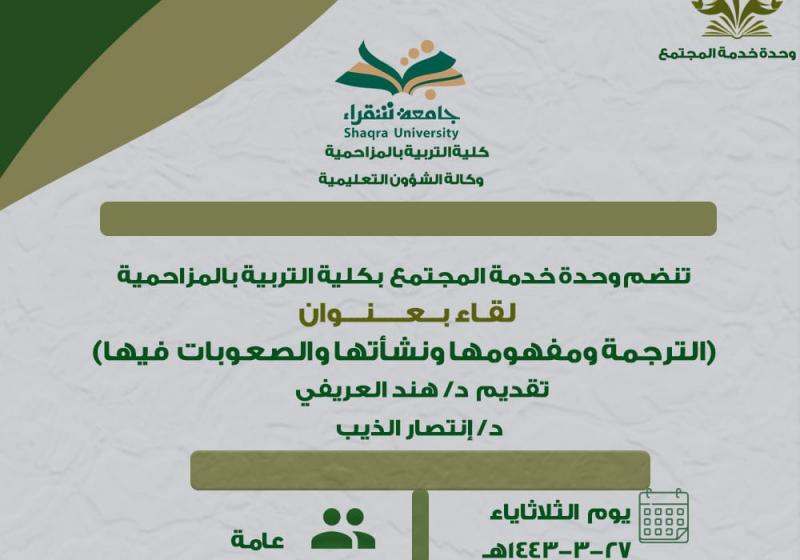 الاثنين 1 نوفمبر تنظم خدمة المجتمع بكلية التربية بالمزاحمية لقاء بعنوان الترجمة ومفهومها ونشأتها والصعوبات فيها