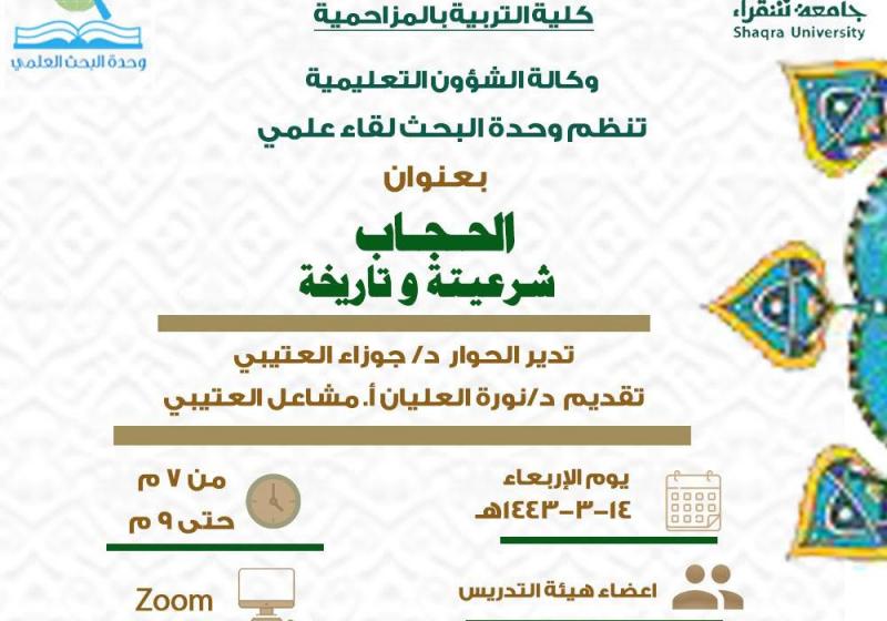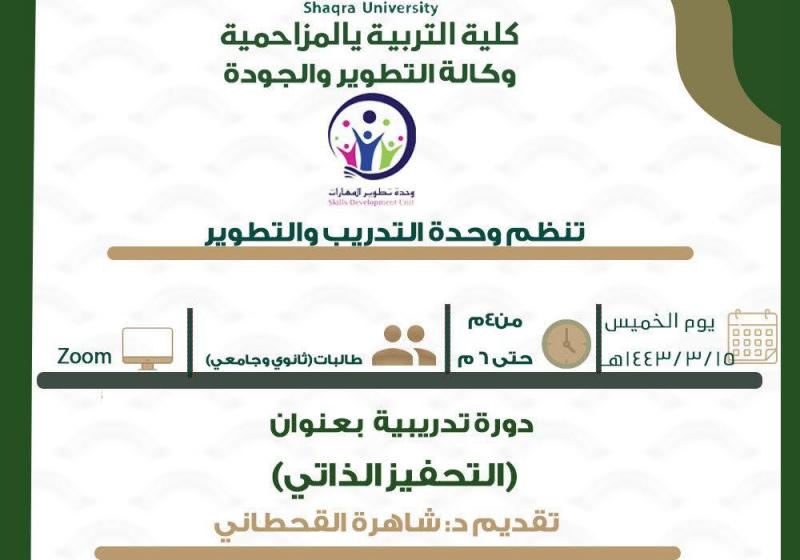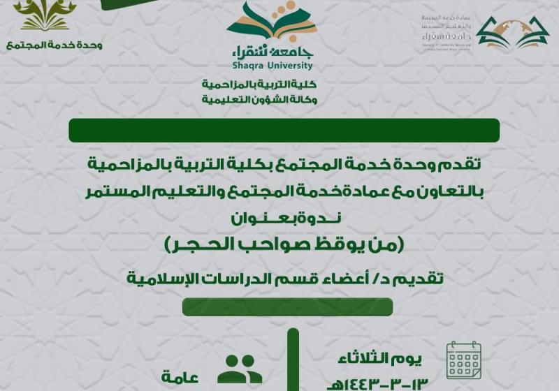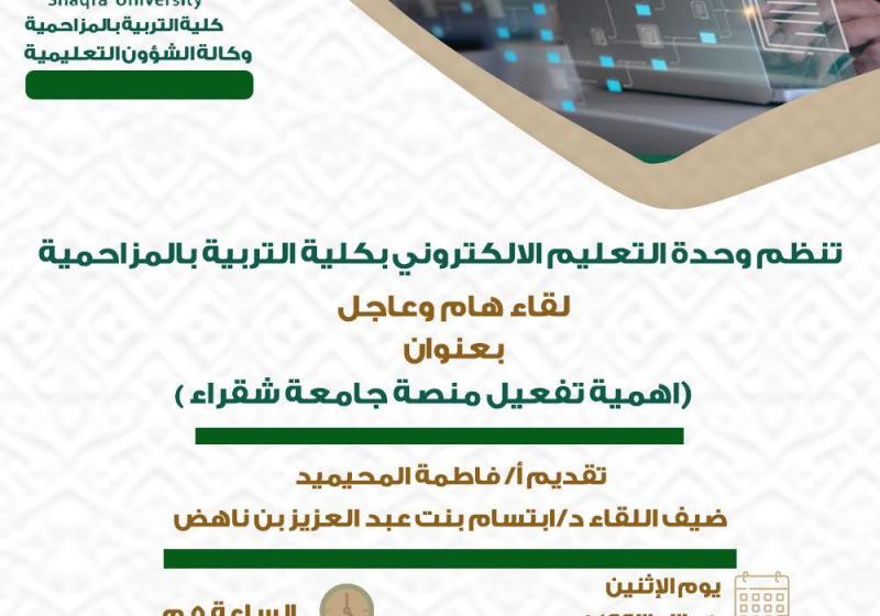 الأربعاء 20 أكتوبر وحده التدريب والتطوير تنظم دوره تدريبيه بعنوان التحفيز الذاتي الثلاثاء 19 أكتوبر وحدة التطوير والجوده تنظم دورة تدريبية بعنوان تاريخ الرياضيات الاثنين 18 أكتوبر لقاء بعنوان الحجاب شريعتة وتاريخة الاثنين 18 أكتوبر من يوقظ صواحب الحجر الأحد 10 أكتوبر تنظم وحدة التعليم الاكتروني لقاء هام وعاجل بعنوان (اهمية تفعيل منصة جامعة شقراء) الأحد 10 أكتوبر وحدة التدريب والتطوير تنظم دوره بعنوان( صناعة الغيير) الأحد 10 أكتوبر وحدة التدريب والتطوير تنظم دوره بعنوان (توصيف المقرر) الخميس 7 أكتوبر تعلن وحدة خدمة المجتمع بتعاون مع عمادة خدمة المجتمع والتعليم المستمر اقامة دوره بعنوان (التربية الايجابية) مشاهدة المزيد