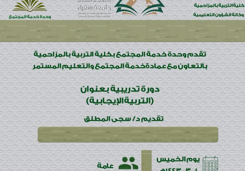 الخميس 7 أكتوبر تعلن وحدة خدمة المجتمع بتعاون مع عمادة خدمة المجتمع والتعليم المستمر اقامة دوره بعنوان (التربية الايجابية)