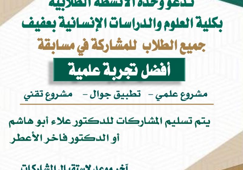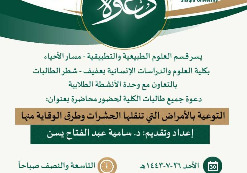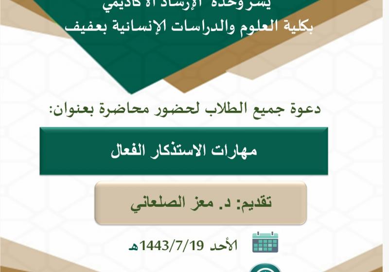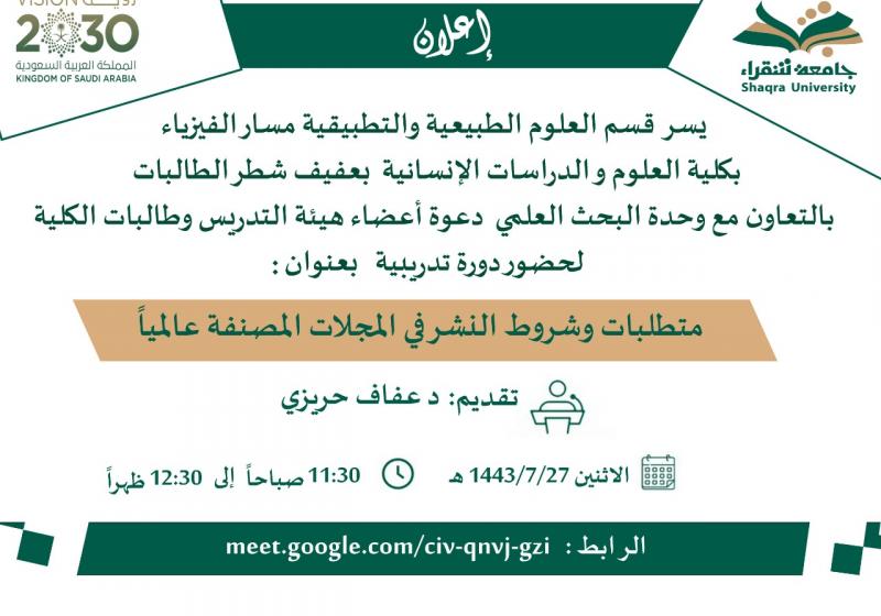 السبت 26 فبراير Academic Writing السبت 26 فبراير متطلبات وشروط النشر في المجلات المصنفة عالميا السبت 26 فبراير الحفل الخطابي بمناسبة يوم التأسيس السبت 26 فبراير فعاليات الأسبوع السابع الجمعة 25 فبراير التوعية بالأمراض التي تنقلها الحشرات وطرق الوقاية منها الثلاثاء 22 فبراير مهارات الاستذكار الفعال الاثنين 21 فبراير مهارات الإستذكار الفعال الاثنين 21 فبراير أفضل تجربة علمية مشاهدة المزيد