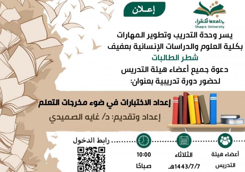 السبت 29 يناير إعداد الإختبارات في ضوء مخرجات التعليم الخميس 27 يناير دور الأنشطة الطلابية في إعداد سفراء الوطن الثلاثاء 25 يناير إعلان إستلام وثيقة التخرج الأحد 12 ديسمبر جدول الإختبارات النهائية للفصل الأول من العام الدراسي 1443 الأحد 12 ديسمبر اللغة العربية لغة القرآن الأربعاء 8 ديسمبر جدار الحملة الأمنية التثقيفية تحت شعار: دمتم سالمين الأربعاء 8 ديسمبر تطبيقات الحاسب في الأعمال المكتبية الأربعاء 8 ديسمبر تصميم الاستبيانات الإلكترونية وتحليلها مشاهدة المزيد