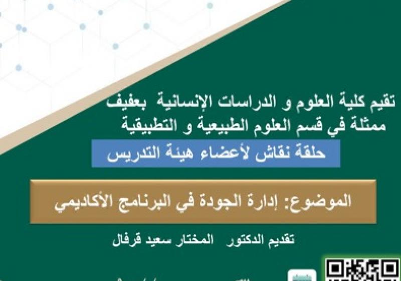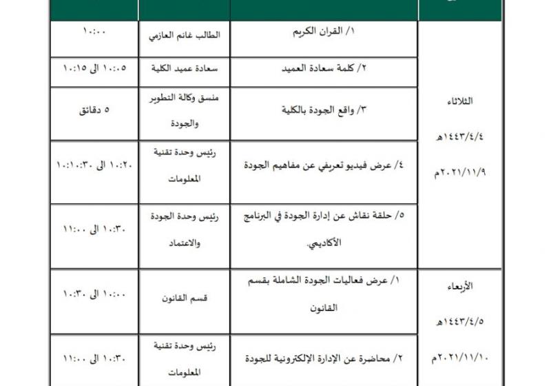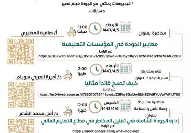 الأربعاء 17 نوفمبر تسجيل البيانات في منصة خريج الأربعاء 17 نوفمبر الملتقى العلمي السادس للإبداع العلمي (موهبة) الاثنين 15 نوفمبر التوعية بمرض السكري السبت 13 نوفمبر تحديات تطبيق القانون الإنساني الدول السبت 13 نوفمبر فضل طلب العلم الأحد 7 نوفمبر الإحتفال باليوم العالمي للجودة 2021 الأحد 7 نوفمبر إدارة الجودة في البرنامج الأكاديمي الأحد 7 نوفمبر الجودة للتميز المستدام مشاهدة المزيد