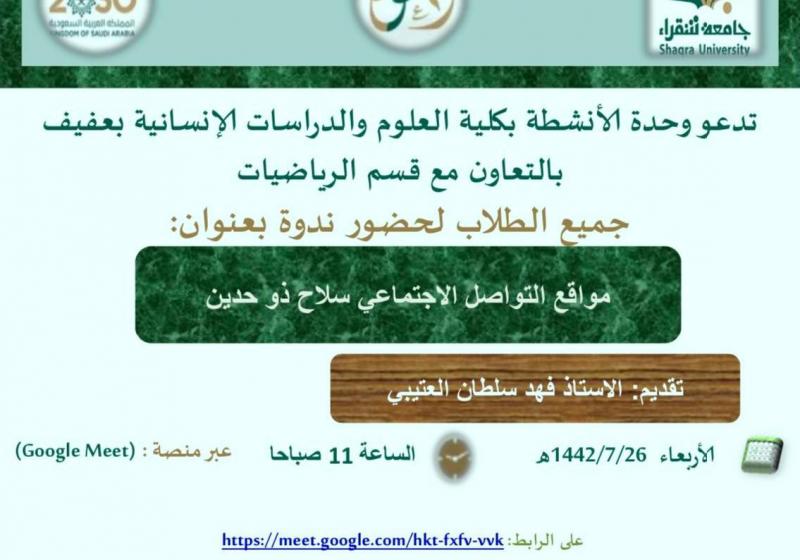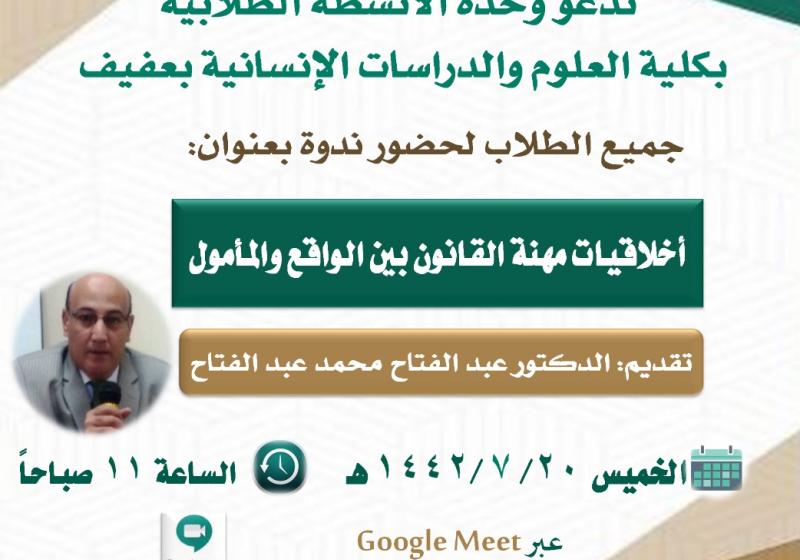 الأربعاء 31 مارس تطبيقات إنترنت الأشياء في مجال الرعاية الصحية الأربعاء 24 مارس الاستقرار النفسي الثلاثاء 9 مارس مواقع التواصل الإجتماعي: سلاح ذو حدين الأربعاء 3 مارس واجبات عضو هيئة التدريس الموجهة الأربعاء 3 مارس أخلاقيات مهنة القانون بين الواقع والمأمول الجمعة 26 فبراير جلسة الحوار الطلابي: الدورات التدريبية عن بعد بين الحاجة والرفاهية الأحد 21 فبراير مسابقة تحدي كورونا COVID-19 وسبل الوقاية منها الاثنين 15 فبراير حقوق وواجبات الطلاب مشاهدة المزيد