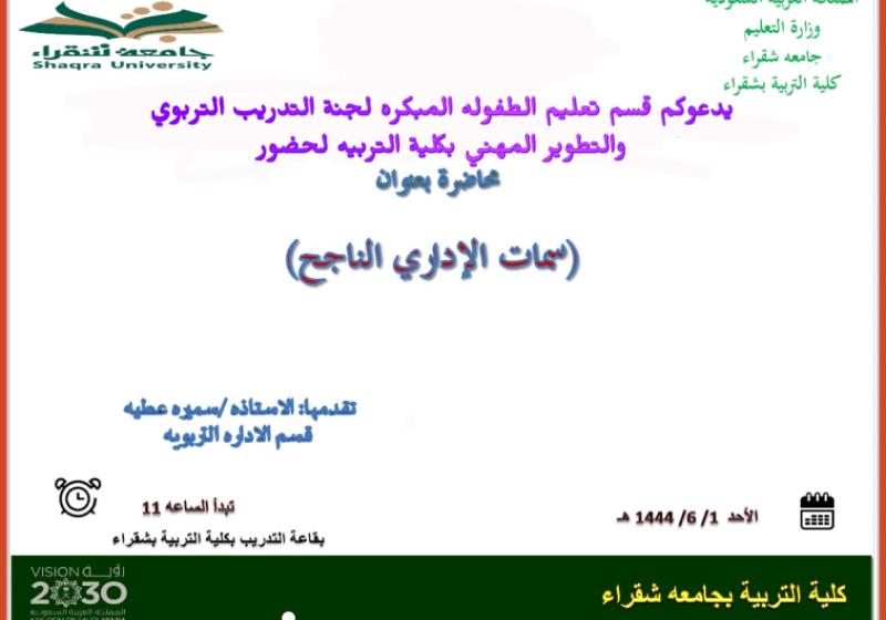 يقيم قسم الطفولة المبكرة ممثلاً بالعيادة الاستشارية التربوية بكلية التربية بشقراء يوم الثلاثاء الموافق 1447/6/18ه محاضرة بعنوان " التعامل مع الطفل العنيد الأسباب والحلول" عبر تطبيق الزوم في تمام الساعة الخامسة والنصف مساءاً تقدمها د. اسماء عيسى .
