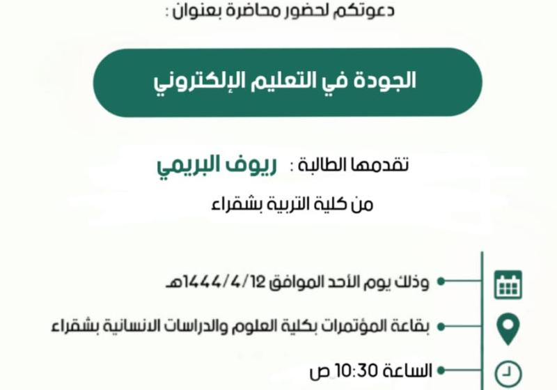 يقيم قسم الطفولة المبكرة ممثلاً بالعيادة الاستشارية التربوية بكلية التربية بشقراء يوم الثلاثاء الموافق 1447/6/18ه محاضرة بعنوان " التعامل مع الطفل العنيد الأسباب والحلول" عبر تطبيق الزوم في تمام الساعة الخامسة والنصف مساءاً تقدمها د. اسماء عيسى .