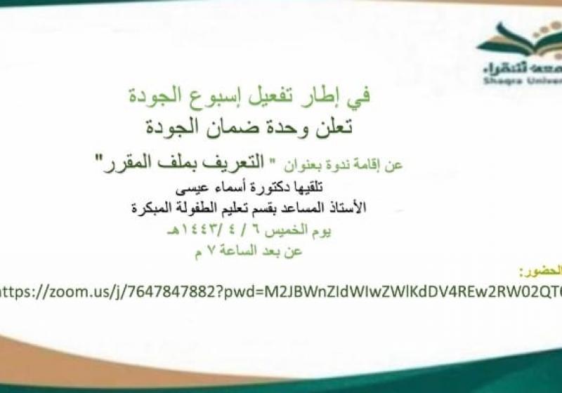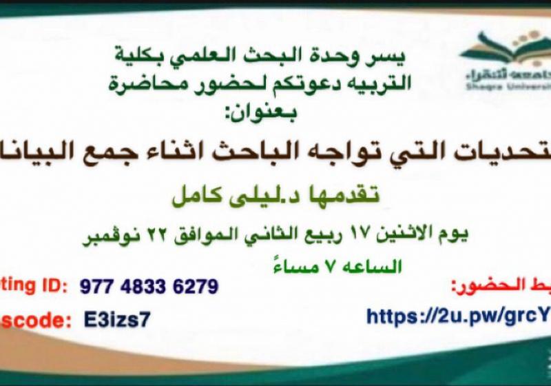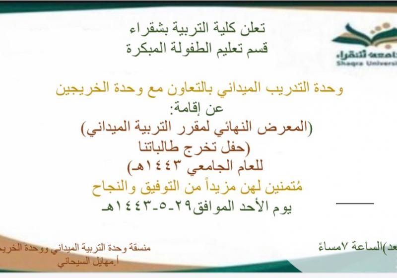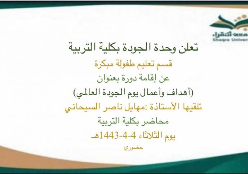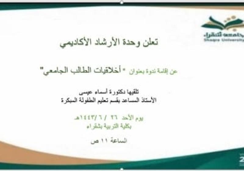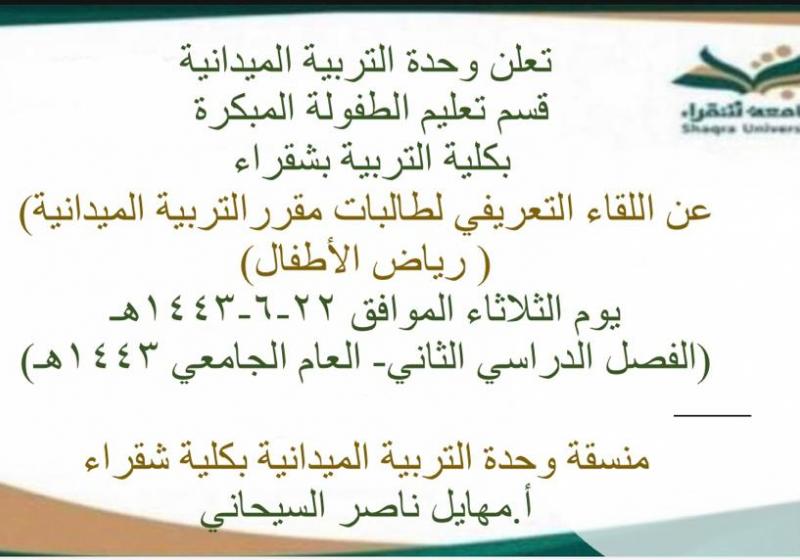 يقيم قسم الطفولة المبكرة ممثلاً بالعيادة الاستشارية التربوية بكلية التربية بشقراء يوم الثلاثاء الموافق 1447/6/18ه محاضرة بعنوان " التعامل مع الطفل العنيد الأسباب والحلول" عبر تطبيق الزوم في تمام الساعة الخامسة والنصف مساءاً تقدمها د. اسماء عيسى .