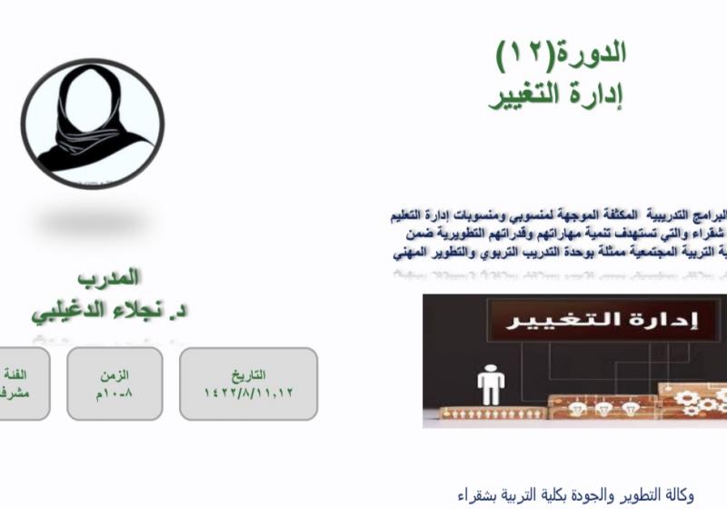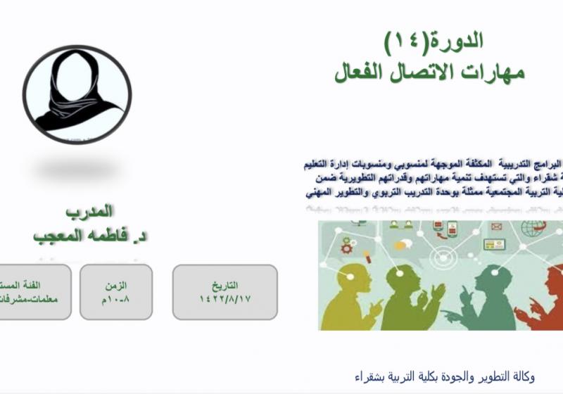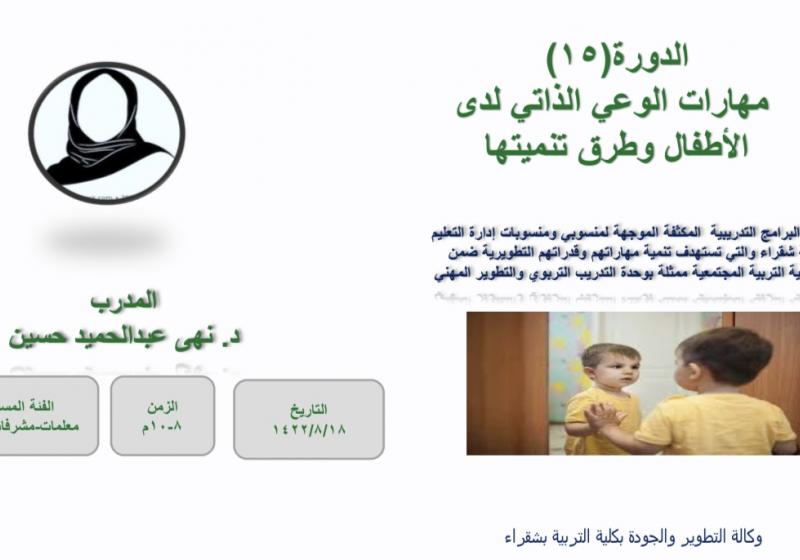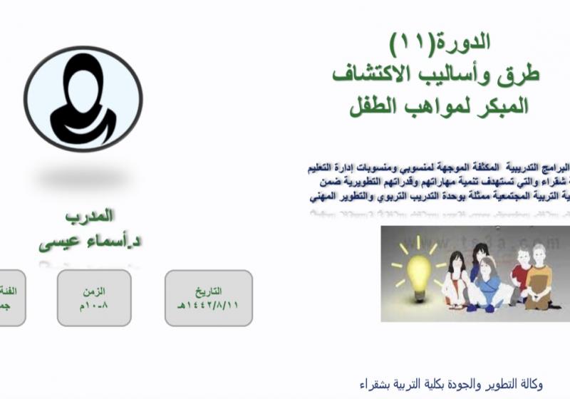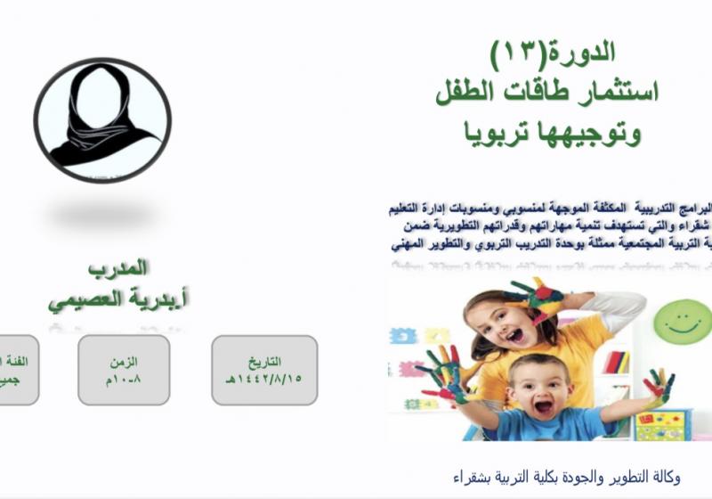 يقيم قسم الطفولة المبكرة ممثلاً بالعيادة الاستشارية التربوية بكلية التربية بشقراء يوم الثلاثاء الموافق 1447/6/18ه محاضرة بعنوان " التعامل مع الطفل العنيد الأسباب والحلول" عبر تطبيق الزوم في تمام الساعة الخامسة والنصف مساءاً تقدمها د. اسماء عيسى .