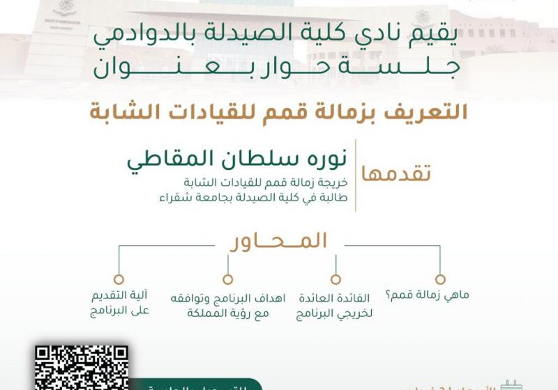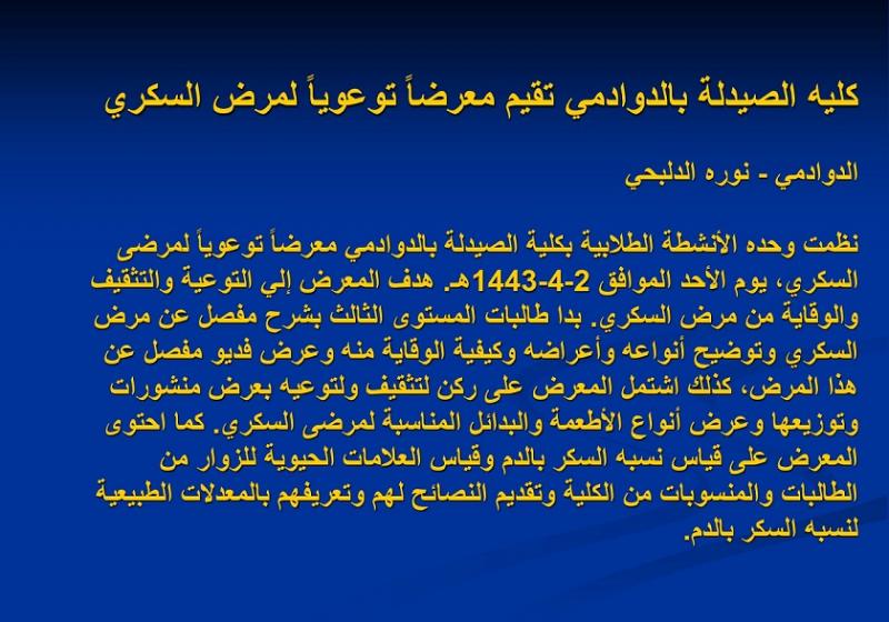 برنامج اليوم الوطني 91 بكلية الصيدلة_1443 هـ.pdf1.51 ميغابايت السبت 18 ديسمبر كلية الصيدلة بجامعة شقراء تطلق حمله توعويه لمكافحة التدخين بالمكان-مول بالدوادمي الثلاثاء 16 نوفمبر يوم التوعية بمرض السكري الأحد 7 نوفمبر كليه الصيدلة بالدوادمي تقيم معرضاً توعوياً لمرض السكري الأحد 7 نوفمبر بداية فعاليات يوم الجودة العالمى من 7 إلى 11 نوفمبر 2021 الأربعاء 3 نوفمبر محاضرة بكلية الصيدلة-اليوم الاربعاء-03-11-2021. الأربعاء 27 أكتوبر محاضرة بكلية الصيدلة بالدوادمي الموافق 27-10-2010 الأربعاء 3 فبراير تقرير عن اقامة: في عالم افتراضي يختصر المسافات، تم إقامة جلسة حوار عن زمالة قمم للقيادات الشابة. الأربعاء 3 فبراير لحضور جلسة حوار بعنوان (التعريف بزمالة قمم للقيادات الشابة)