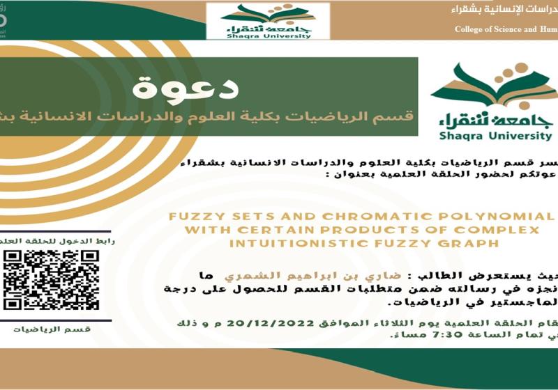 الثلاثاء 20 ديسمبر حلقة علمية بعنوان "FUZZY SETS AND CHROMATIC POLYNOMIAL WITH CERTAIN PRODUCTS OF COMPLEX INTUITIONISTIC FUZZY GRAPH" بقسم الرياضيات