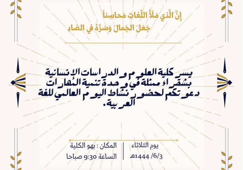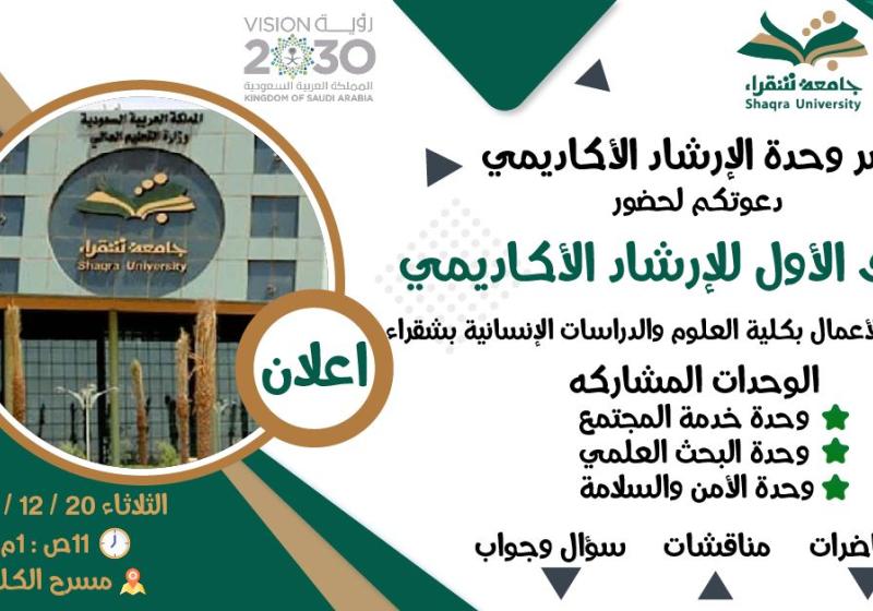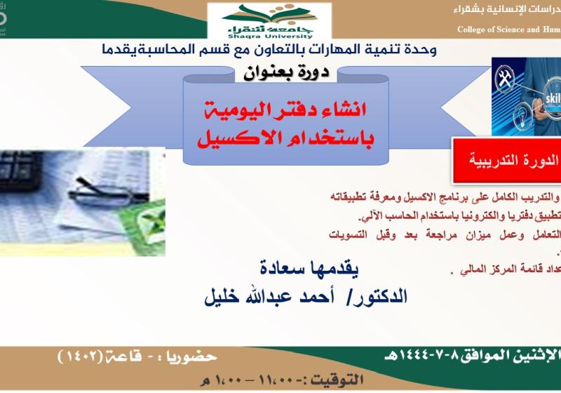 الأحد 29 يناير المعرض العلمي بالكلية للعام 1444هـ برعاية سعادة رئيس الجامعه الأحد 29 يناير " انشاء دفتر اليومية باستخدام برنامج الاكسيل" ندوة لوحدة تنمية المهارات الأربعاء 25 يناير "دور أنظمة الاتصالات الحديثة وتكنولوجيا المعلومات في تحسين جودة "المعلومات المحاسبية" حلقة نقاشية بقسم المحاسبة الثلاثاء 24 يناير "التهيئة للاختبارات النهائية" ورشه عمل للطالبات الأحد 8 يناير "التلوث الضوضائي" نشاط طلابي بشطر الطالبات الثلاثاء 27 ديسمبر اليوم العالمي للغة العربية الثلاثاء 20 ديسمبر "المنتدى الأول للإرشاد الأكاديمي" بقسم إدارة الأعمال الثلاثاء 20 ديسمبر حلقة علمية بعنوان "FUZZY SETS AND CHROMATIC POLYNOMIAL WITH CERTAIN PRODUCTS OF COMPLEX INTUITIONISTIC FUZZY GRAPH" بقسم الرياضيات مشاهدة المزيد