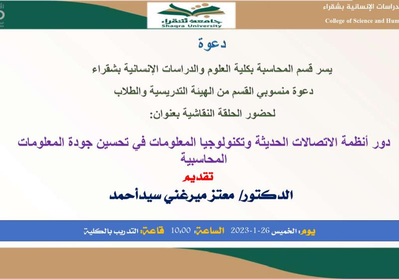 الأربعاء 25 يناير "دور أنظمة الاتصالات الحديثة وتكنولوجيا المعلومات في تحسين جودة "المعلومات المحاسبية" حلقة نقاشية بقسم المحاسبة
