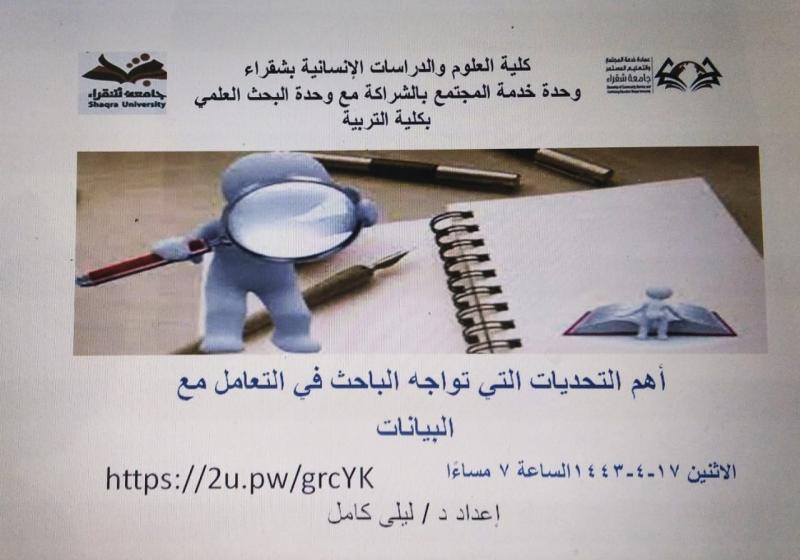 الأحد 21 نوفمبر أهم التحديات التي تواجه الباحث في التعامل مع البيانات-محاضرة لوحدة خدمه المجتمع بالكلية