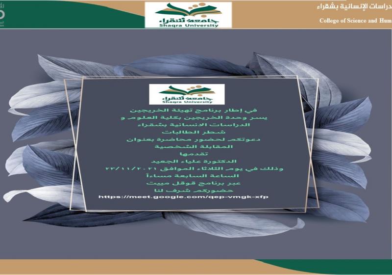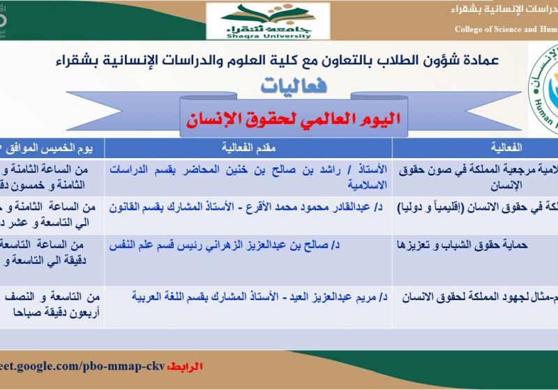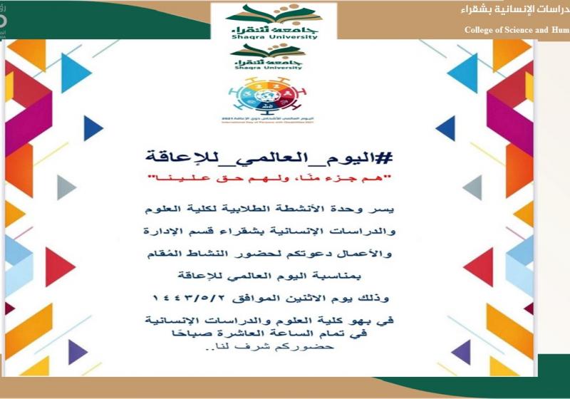الخميس 20 يناير لماذا احتاج المرشد الاكاديمي؟ الخميس 9 ديسمبر اليوم العالمي لحقوق الإنسان الاثنين 6 ديسمبر اليوم العالمي للإعاقة بعنوان " هم جزء منٌا، ولهم حق علينا" الأحد 5 ديسمبر اليوم العالمي للتطوع الاثنين 22 نوفمبر "المنجزات الوطنية" محاضرة بقسم دارة الأعمال الاثنين 22 نوفمبر " المقابلة الشخصية" محاضرة للخريجات بشطر الطالبات الأحد 21 نوفمبر أهم التحديات التي تواجه الباحث في التعامل مع البيانات-محاضرة لوحدة خدمه المجتمع بالكلية الأحد 21 نوفمبر "مناهج البحث العلمي ومصطلحاته" دورة بقسم اللغة الإنجليزية مشاهدة المزيد