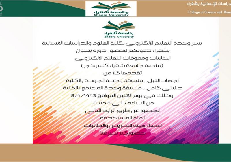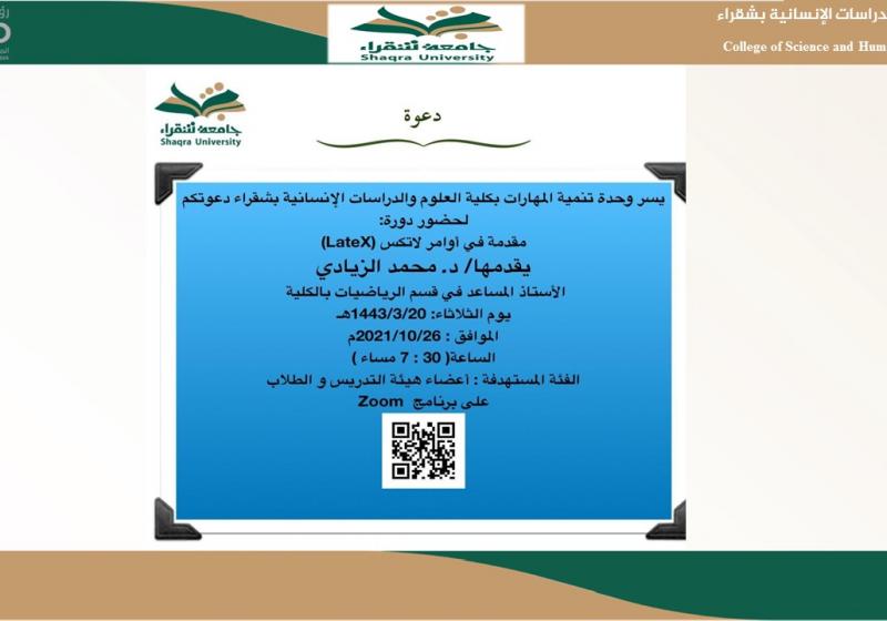الجمعة 5 نوفمبر ورشه عمل " إيجابيات ومعوقات التعليم الإلكتروني" (منصة جامعة شقراء كنموذج) الجمعة 5 نوفمبر دورة "مهارة كتابة الخطابات الرسمية" الاثنين 25 أكتوبر دورة بعنوان " مقدمه في أوامر لاتكس ( LateX )" يقدمها الدكتور/ محمد الزيادي السبت 16 أكتوبر دورة تدريبية بنادي اللغة الإنجليزية بعنوان "Data Analysis and Statistics (1)" الثلاثاء 12 أكتوبر حلقة نقاش بقسم الرياضيات بعنوان" علم اتخاذ القرار بين الماضي و الحاضر" للمبتعث/ محمد العمار الأحد 10 أكتوبر حلقة نقاشية بعنوان " Challenges of Rendering Anthropomorphism in the Quran " الأحد 3 أكتوبر دعوة حضور حلقة نقاشية علمية بقسم الرياضيات الخميس 23 يناير مسابقة البحث العلمي و الباحث الأكثر استشهاداً باعماله البحثية مشاهدة المزيد