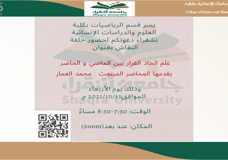 الثلاثاء 12 أكتوبر حلقة نقاش بقسم الرياضيات بعنوان" علم اتخاذ القرار بين الماضي و الحاضر" للمبتعث/ محمد العمار
