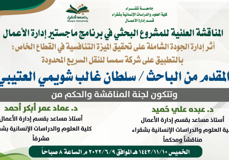 الأربعاء 8 يونيو مناقشة المشروع البحثي في برنامج ماجستير إدارة الأعمال للباحث/ سلطان غالب شويمي العتيبي