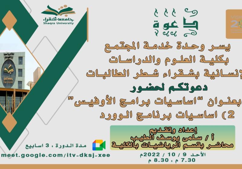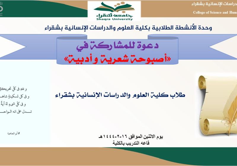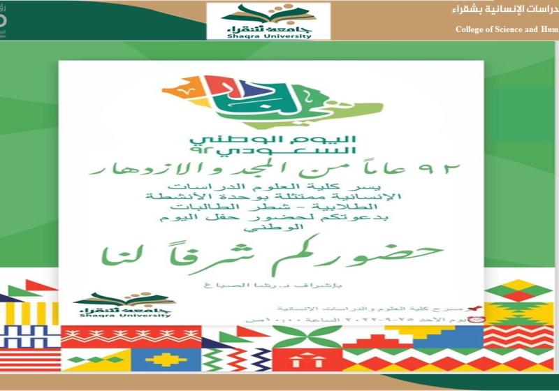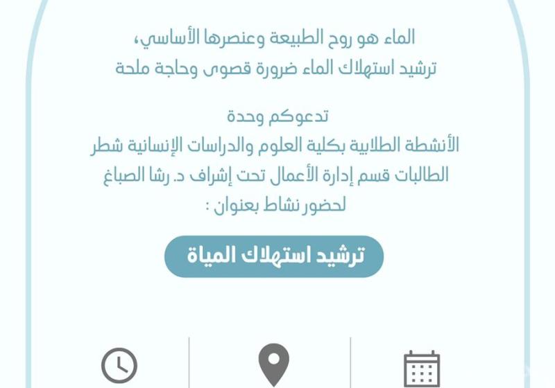 الأربعاء 5 أكتوبر "ترشيد استهلاك المياه " ندوة طلابية بشطر الطالبات الأربعاء 5 أكتوبر «أثر الإفصاح عن التقرير المتكامل على سيولة الأسهم بالتطبيق على الشركات المدرجة في سوق الأوراق المالية السعودية» حلقة نقاش بقسم المحاسبة الثلاثاء 4 أكتوبر The scope and opportunities of English language and literature among" the budding students" دورة تدريبية بقسم اللغة الانجليزية السبت 1 أكتوبر اساسيات برامج الاوفيس- دورة تدريبية بشطر الطالبات السبت 24 سبتمبر دعوةلحضور احتفالية الكلية باليوم الوطني ال 92 بشطر الطلاب السبت 24 سبتمبر دعوة لحضور احتفالية شطر الطالبات باليوم الوطني ال 92 الاثنين 12 سبتمبر دعوة للمشاركة في « أصبوحة شعرية و أدبية» لطلاب الكلية الأربعاء 8 يونيو مناقشة المشروع البحثي في برنامج ماجستير إدارة الأعمال للباحث/ سلطان غالب شويمي العتيبي مشاهدة المزيد