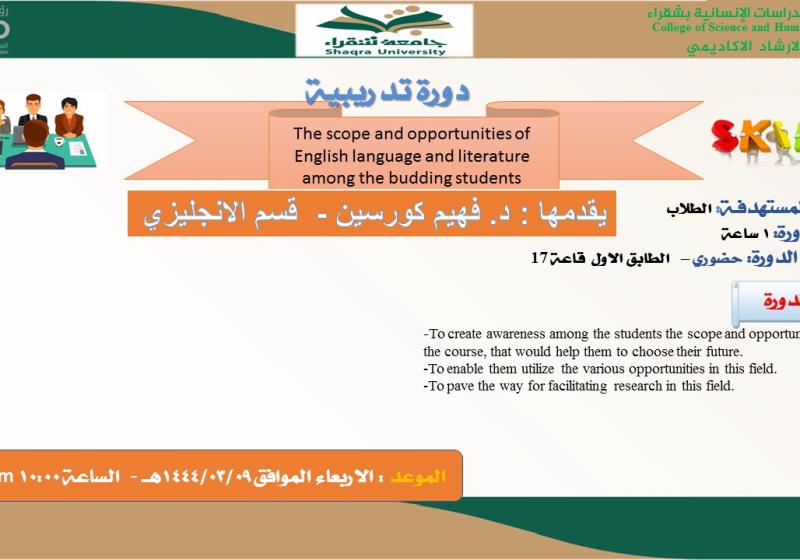 الثلاثاء 4 أكتوبر The scope and opportunities of English language and literature among" the budding students" دورة تدريبية بقسم اللغة الانجليزية