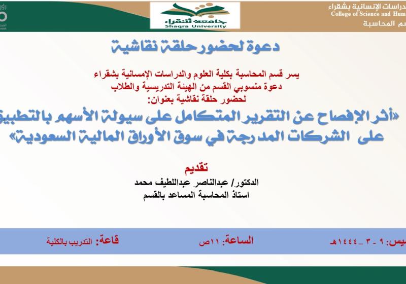 الأربعاء 5 أكتوبر «أثر الإفصاح عن التقرير المتكامل على سيولة الأسهم بالتطبيق على الشركات المدرجة في سوق الأوراق المالية السعودية» حلقة نقاش بقسم المحاسبة