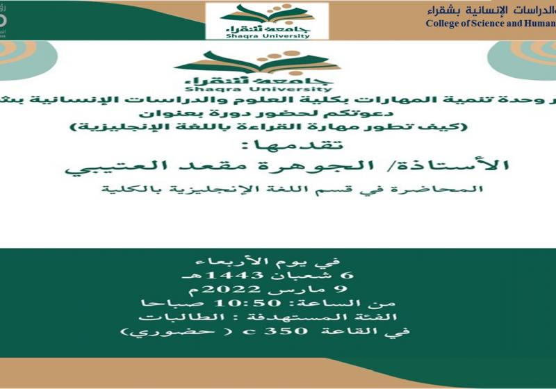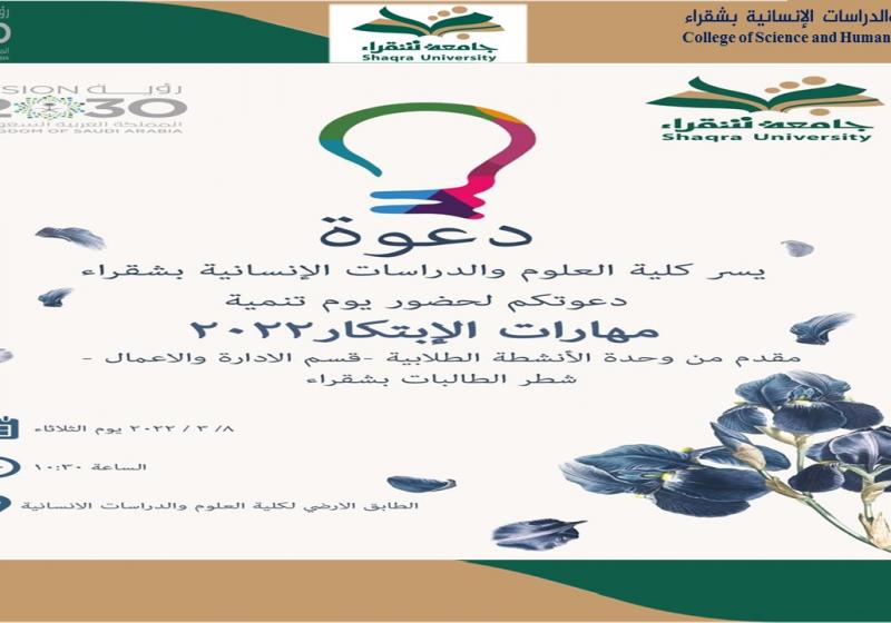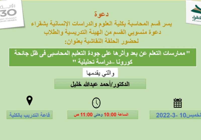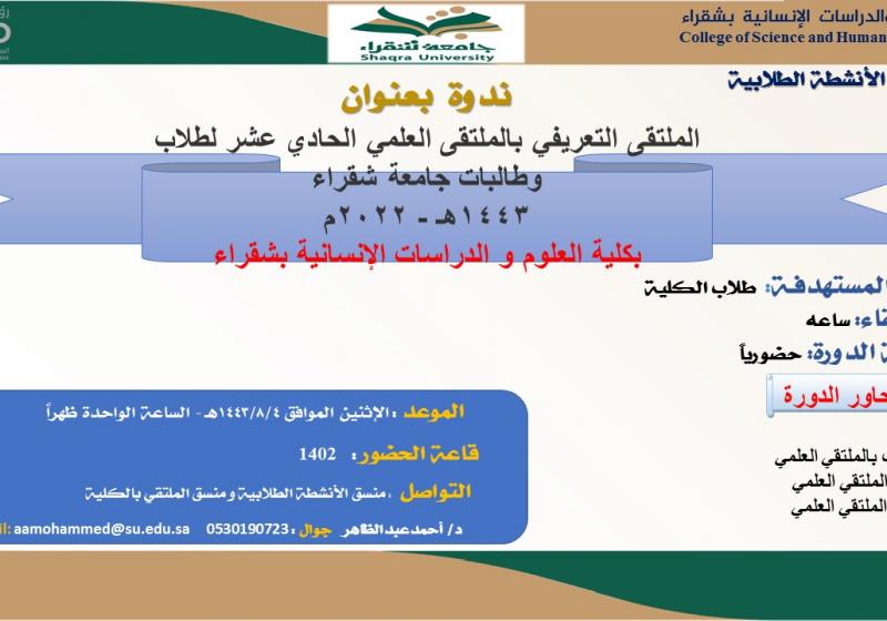 السبت 5 مارس الملتقى التعريفي بالملتقى العلمي الحادي عشر لطلاب وطالبات جامعة شقراء 1443هـ - 2022م بكلية العلوم و الدراسات الإنسانية بشقراء