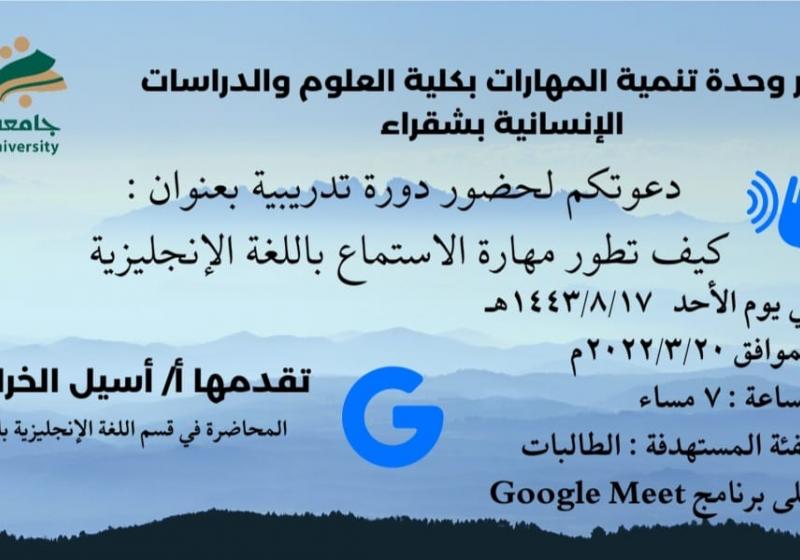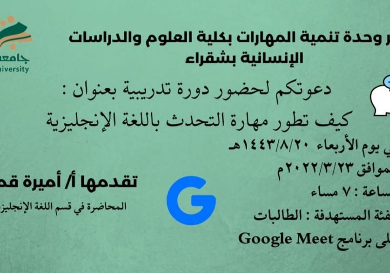 الثلاثاء 8 مارس "يوم تنمية مهارات الابتكار 2022 " بوحدة الأنشطة الطلابية الثلاثاء 8 مارس " نحو مستقبل واعد" دورة بوحدة تنمية المهارات الثلاثاء 8 مارس "كيف تطور مهارة الاستماع بالغة الإنجليزية" دورة تدريبية بوحدة تنمية المهارات الاثنين 7 مارس "كيف تطور مهارة التحدث باللغة الإنجليزية" دورة تدريبية بوحدة تنمية المهارات الاثنين 7 مارس " اكتشفي ذاتك" دورة بوحدة تنمية المهارات الاثنين 7 مارس ممارسات التعلم عن بعد و اثرها على جودة التعليم المحاسبي في ظل جائحة كورونا- دراسة تحليلية. السبت 5 مارس الملتقى التعريفي بالملتقى العلمي الحادي عشر لطلاب وطالبات جامعة شقراء 1443هـ - 2022م بكلية العلوم و الدراسات الإنسانية بشقراء الخميس 3 مارس " كيف تطور مهارة القراءة باللغة الإنجليزية" دورة تدريبية مشاهدة المزيد