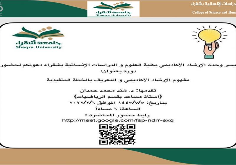 الأربعاء 16 فبراير Numerical Methods for the Solution of Differential" Equations of Fractional Order" ندوة علمية بقسم الرياضيات الأحد 13 فبراير اليوم الخليجي لحقوق المرضى 2022 الأربعاء 9 فبراير "التعبد بالصمت صوره وأحكامه" حلقة نقاش بقسم الدراسات الإسلامية الأحد 6 فبراير مفهوم الإرشاد الأكاديمي و التعريف بالخطة التنفيذية الأحد 21 نوفمبر دورة تدريبية بعنوان" الإعداد لاختبار التوفل" بوحدة تنميه المهارات الأربعاء 8 ديسمبر "اليوم العالمي لذوي الإعاقة " بقسم إدارة الأعمال الأحد 21 نوفمبر " اليوم العالمي للسلام " بقسم اللغة الإنجليزية الأربعاء 17 نوفمبر " تنمية مهارات التفكير الشامل " ورشه عمل لطلاب قسم اللغة الإنجليزية مشاهدة المزيد