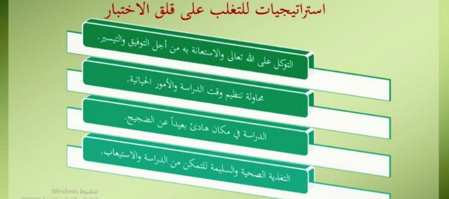 كما تم استعراض مستويات قلق الاختبار والتي تم تقسيمها لثلاثة مستويات وهي (قلق الاختبار الميسر، وقلق الاختبار المنخفض، وقلق الاختبار المدمر).