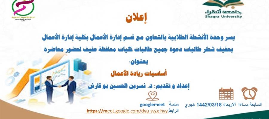 يسر وحدة الأنشطة الطلابية بالتعاون مع قسم إدارة الأعمال بكلية إدارة الأعمال بعفيف شطر طالبات دعوة جميع طالبات كليات محافظة عفيف لحضور محاضرة بعنوان: