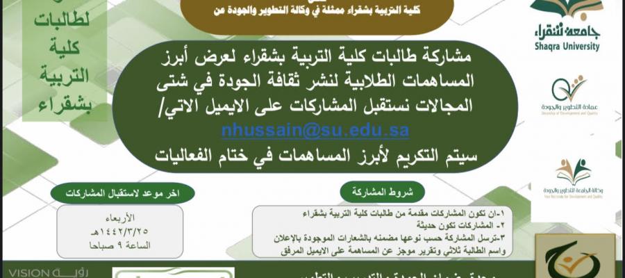 تعلن كلية التربية بشقراء مشاركة طالباتها لعرض أبرز المساهمات الطلابية لنشر ثقافة الجودة في شتى المجالات .