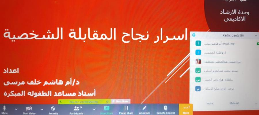 حرصاً من كلية التربية بالدوادمى لتفعيل خطة الإرشاد الجماعى للطالبات ، أقامت وحدة الإرشاد الأكاديمى بالكلية دورة للإرشاد الجماعى يوم الأثنين ،الموافق  10 / 7/1442 هـ ، أقامتها د. أم هاشم خلف مرسى أستاذ مساعد بقسم الطفولة المبكرة بالكلية بعنوان ( أسرار نجاح المقابلة الشخصية ).