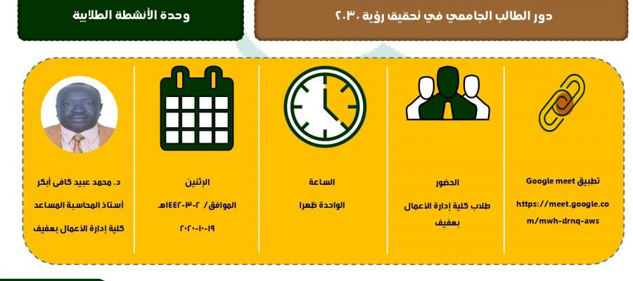 تعلن كلية إدارة الأعمال بعيف عن إقامة الدورة بعنوان "دور الطالب الجامعى فى تحقيق رؤية 2030"