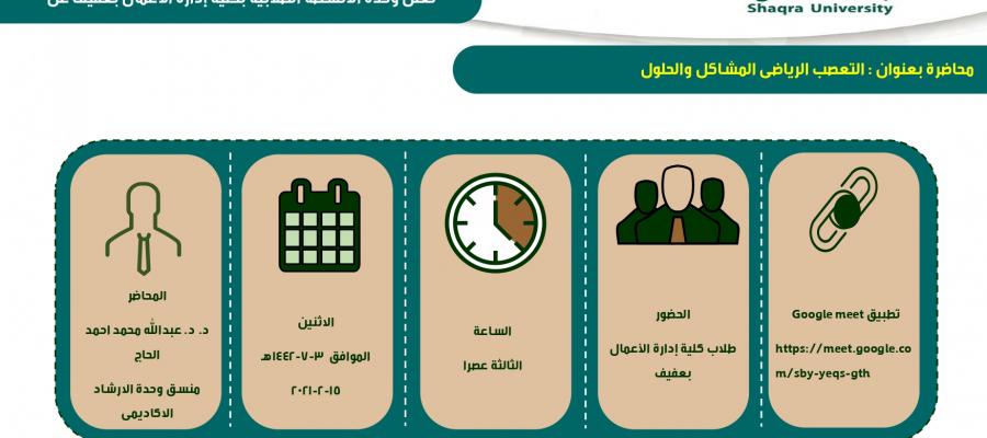 تعلن كلية إدارة الأعمال بعفيف عن محاضرة بعنوان : التعصب الرياضى المشاكل والحلول لطلاب كلية إدارة الأعمال بعفيف،