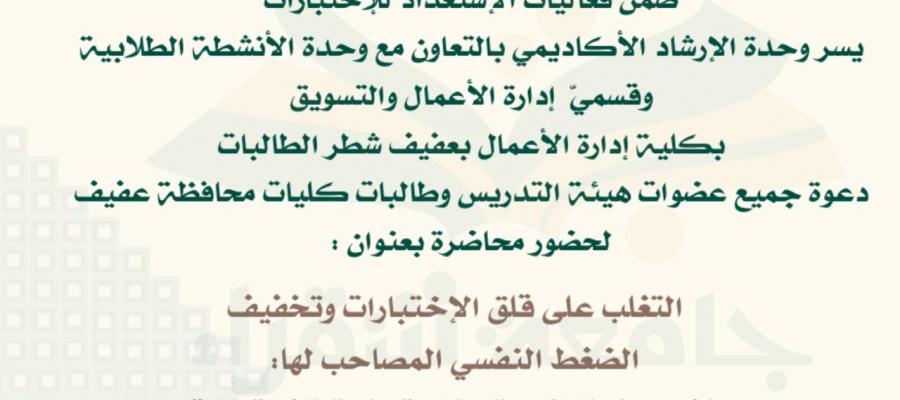 ضمن فعاليات الإستعداد للاختبارات يسر وحدة الارشاد الاكاديمى مع وحدة الأنشطة الطلابية وقسمى إدارة الأعمال والتسويق بكلية إدارة الأعمال بعفيف/ طالبات