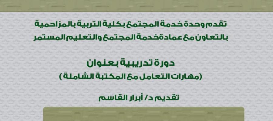 وحدة خدمة المجتمع بتعاون مع عمادة خدمة المجتمع والتعليم المستمر دورة تدريبية بعنوان (مهارات التعامل مع المكتبة الشاملة )