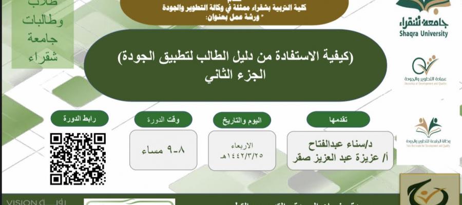 ورشة عمل بعنوان (كيفية الإستفادة من دليل الطالب لتطبيق الجودة ) الجزء الثاني .