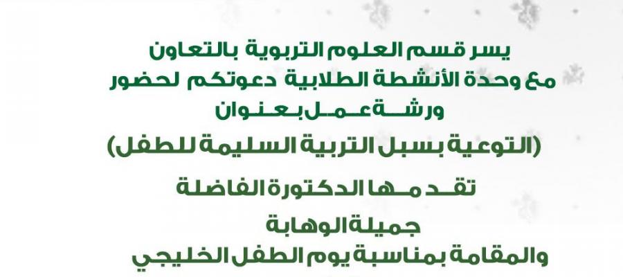 ينظم قسم العلوم التربويه بالتعاون مع وحدة الانشطه الطلابية دوره بعنوان التوعيه بسبل التربيه السليمه للطفل
