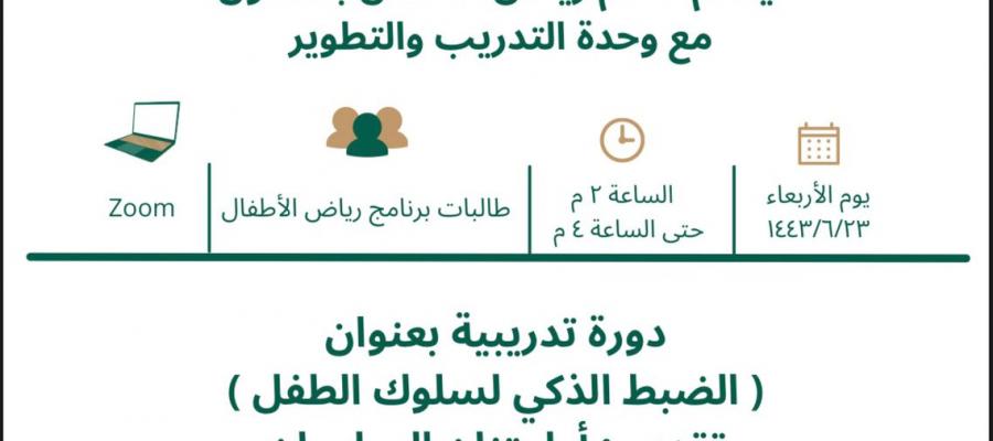 ينظم قسم رياض الاطفال بتعاون مع وحدة التدريب والتطوير دوره تدريبية بعنوان الضبط الذكي لسلوك الطفل مع الاستاذه امتنان السليمان