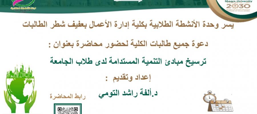 محاضرة بعنوان(ترسيخ مبادئ التنمية المستدامة لدى طلاب الجامعة)/ كلية إدارة الأعمال بعفيف