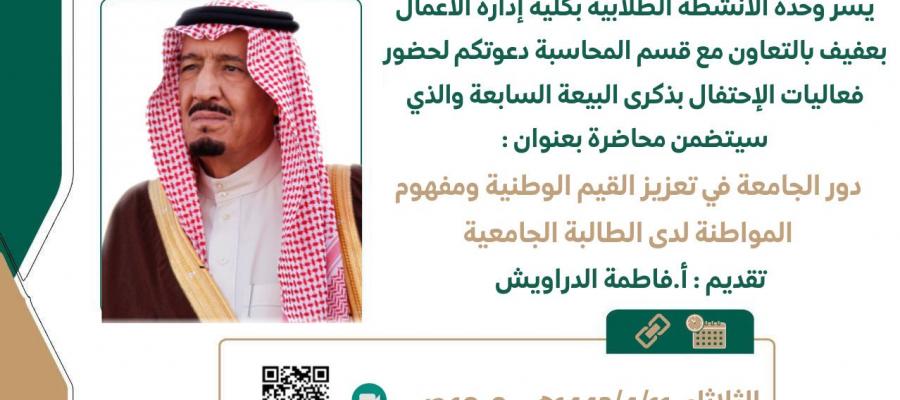 محاضرة بعنوان (دور الجامعة فى تعزيز القيم الوطنية ومفهوم المواطنة لدى الطالبة) بكلية إدارة الأعمال بعفيف/ شطر الطالبات