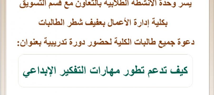 دورة بعنوان : كيف تدعم تطور مهارات التفكير الإبداعى/ بكلية إدارة الأعمال بعفيف طالبات