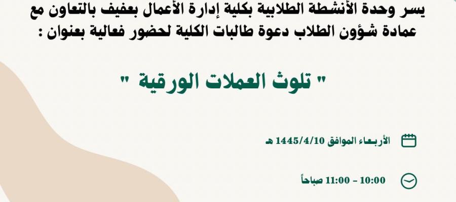 فعالية بعنوان: " تلوث العملات الورقية "/ بكلية ادارة الاعمال بعفيف (طالبات)