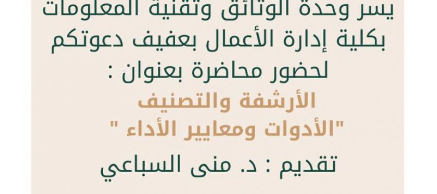 محاضرة بعنوان (الأرشفة والتصنيف " الأدوات ومعايير الأداء") بكلية إدارة الأعمال بعفيف/ شطر الطالبات