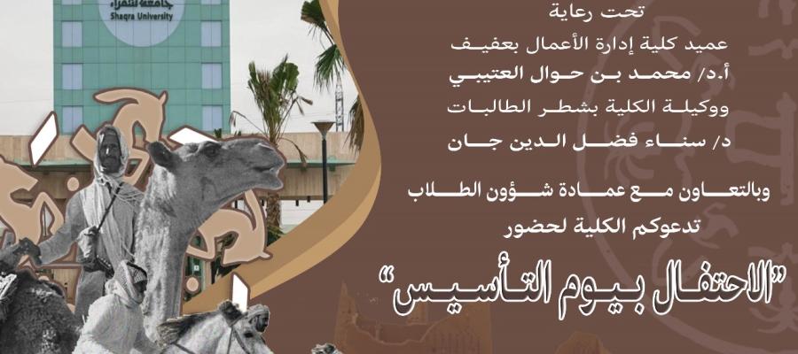 برعاية سعادة عميد كلية إدارة الأعمال بعفيف أ.د محمد بن حوال العتيبي، وبتوجيه واشراف مباشر من سعادة وكيلة الكلية د. سناء فضل الدين جان، وبالتعاون مع عمادة شؤون الطلاب تقيم الكلية الاحتفال بيوم التأسيس 2025م، تنفيذ مجموعة من طالبات الكلية باشراف منسقات الأنشطة بالأقسام العلمية، وذلك يوم الثلاثاء الموافق 18 فبراير 2025م، الساعة 11 صباحا ببهو الكلية شطر الطالبات
