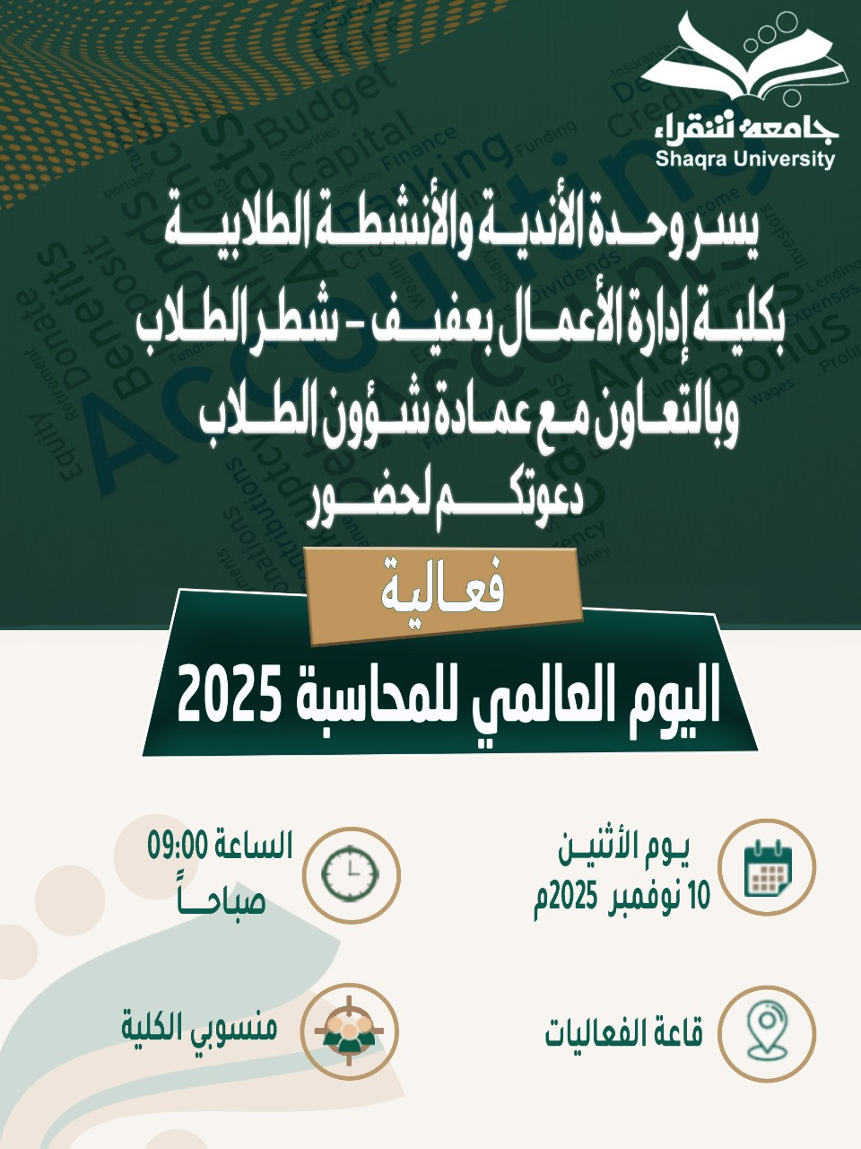 إعلاان الاحتفال باليوم العالمي للمحاسبة للعام 2025م بشطر الطلاب